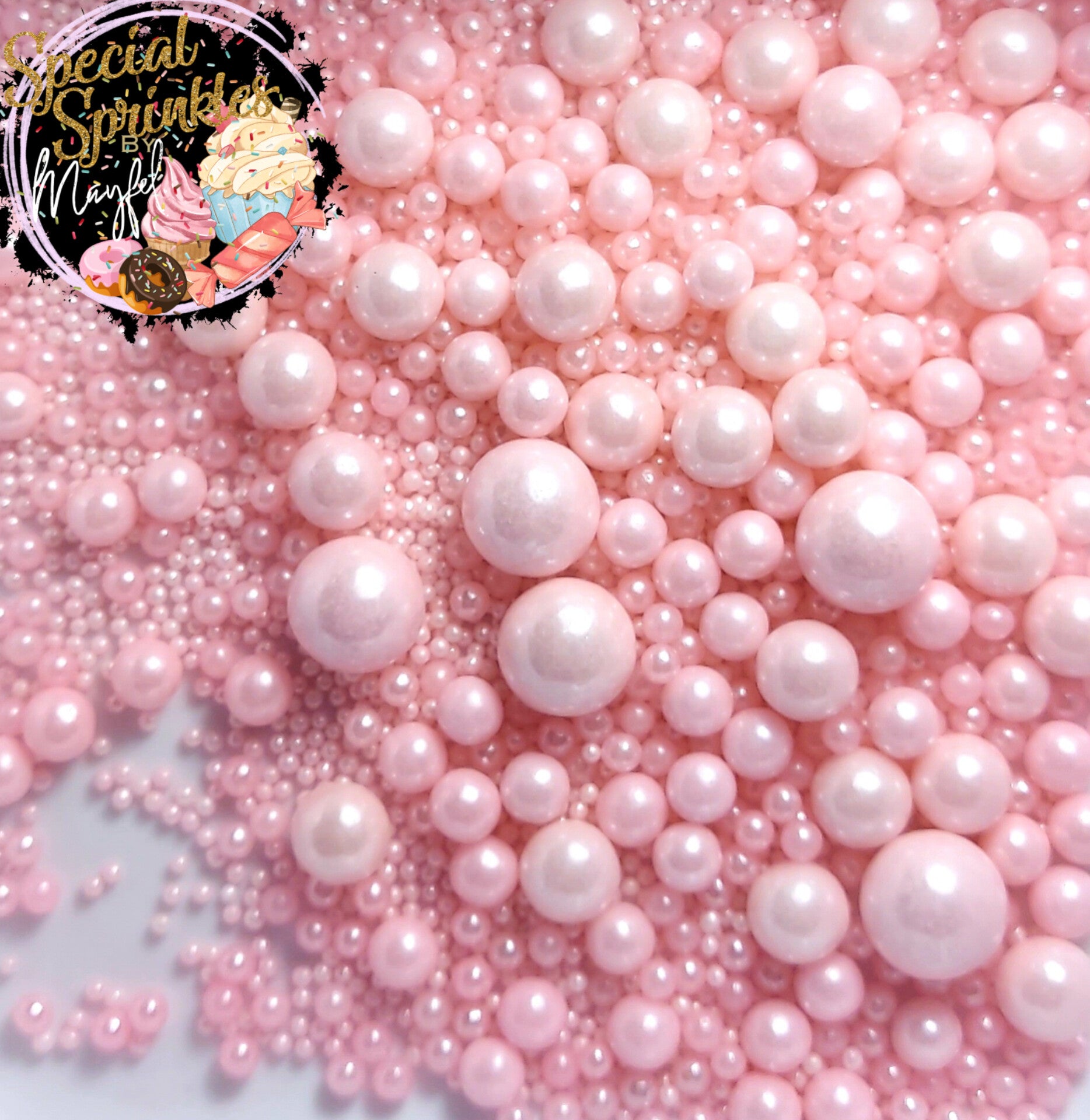 Mezcla de varios tamaños de un delicado color rosa en tamaños (2mm, 4mm, 7mm, 10mm y 12mm). Son 100% comestibles, libres de gluten, nueces y GMO, aprobados por la FDA.