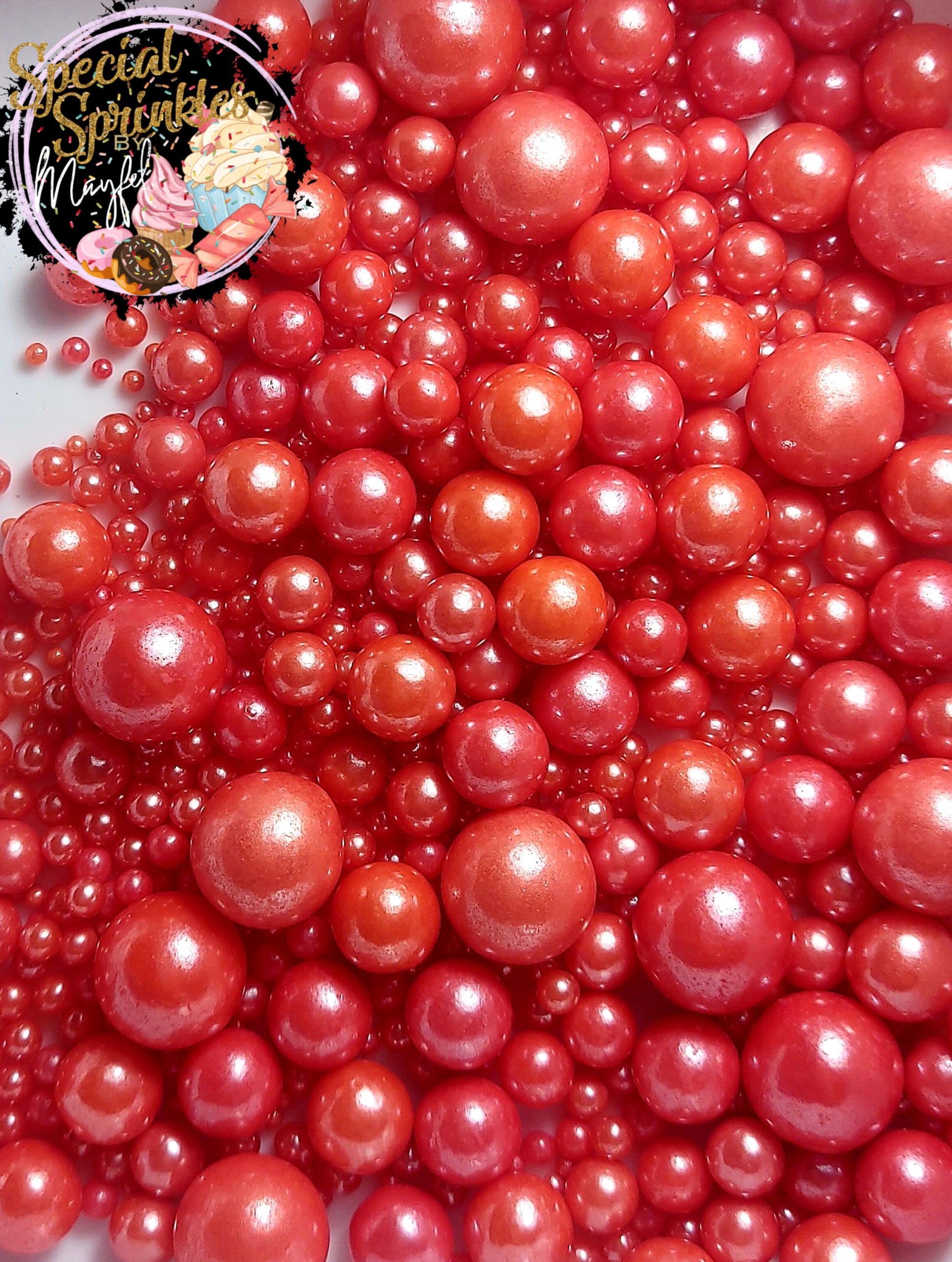 Mezcla de varios tamaños color rojo brillante en tamaños (2mm, 4mm y 7mm, 10mm y 12mm). Son 100% comestibles, libres de gluten, nueces y GMO, aprobados por la FDA.