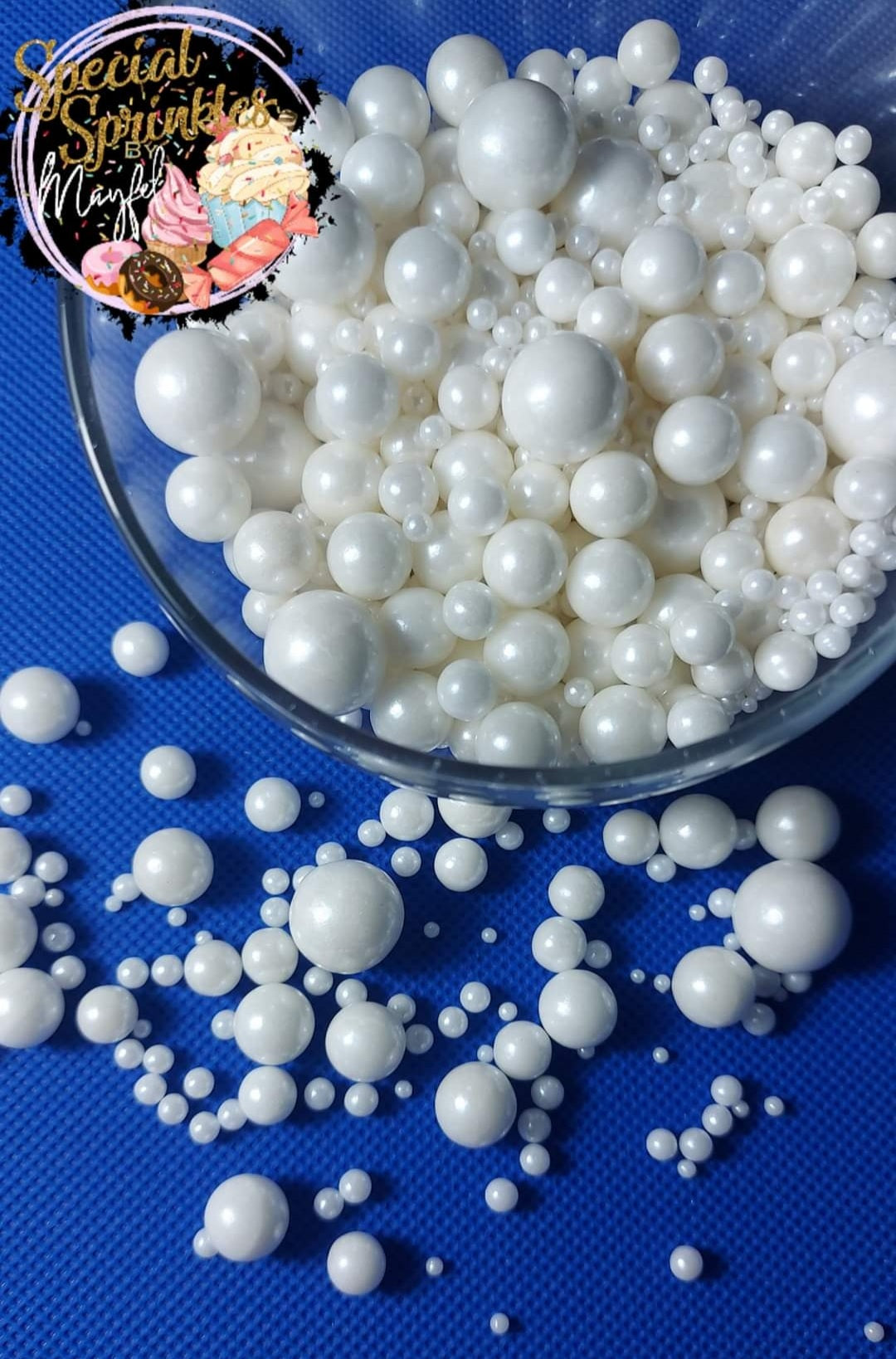 Blancas y delicadas perlas con una tonalidad brillante perlado, estas combinan con todo. Vienen en una mezcla de varios tamaños (2mm, 4mm , 7mm, 10mm ). Son 100% comestibles, libres de gluten, nueces y GMO.