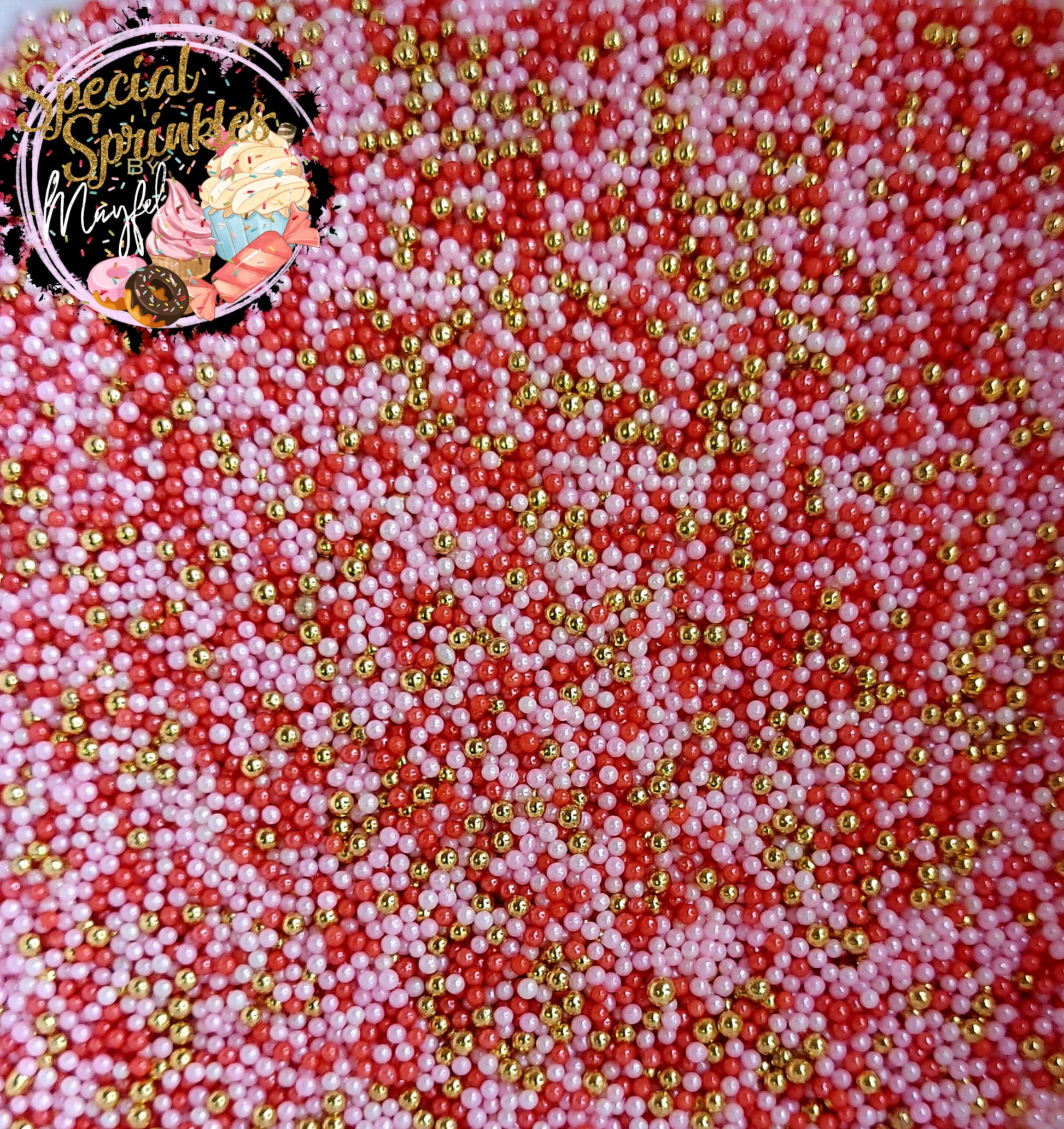 Non pareils perladas color rosa,rojo y oro.Tamaño 2mm. Son libres de gluten y GMO.