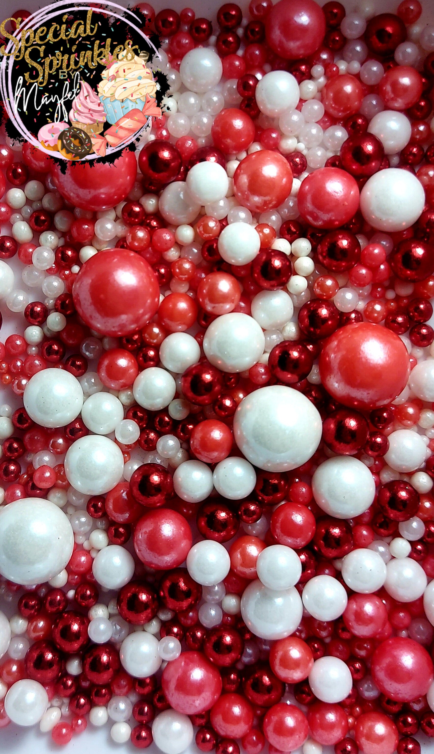 Perlas rojas y blancas con un toque de metálicas rojas.