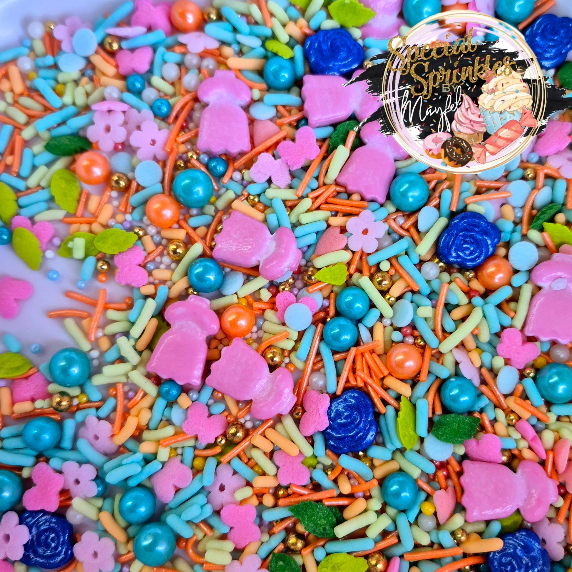 Ingredientes: Contiene Soya, Sugar 71.26%, corn starch 26.97%, dextrin 1.62%, carnauba wax 0.05%, shellac 0.5%, gum Arabic 0.05%, edible colorant E175, E120, E124, E133, E129, E171, E141, E110, E129, 0.03% for serving size (100gr). Son libres de gluten y GMO.