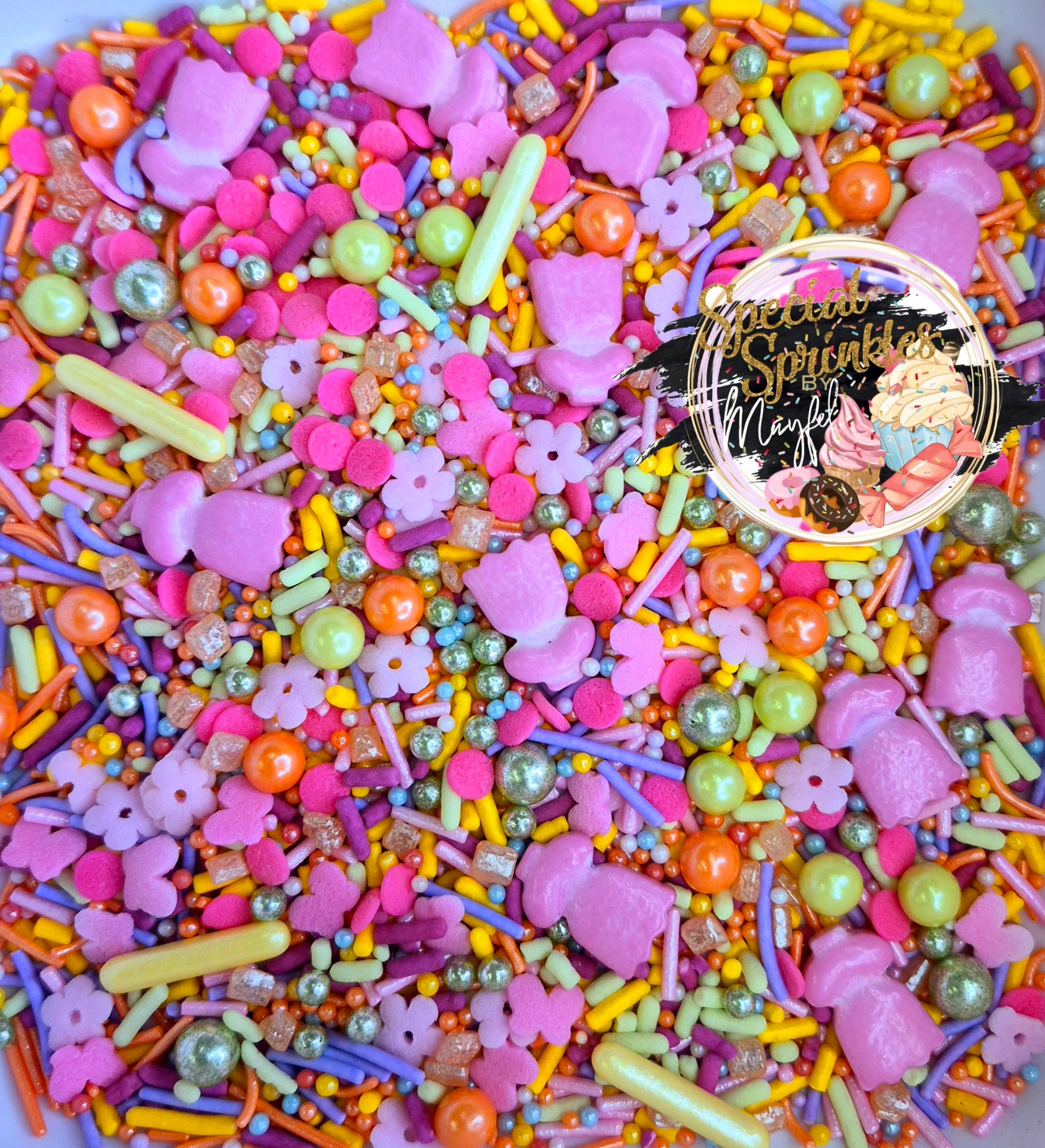 Ingredientes: Contiene Soya, Sugar 71.26%, corn starch 26.97%, dextrin 1.62%, carnauba wax 0.05%, shellac 0.5%, gum Arabic 0.05%, edible colorant E175, E120, E124, E133, E129, E171, E141, E110, 0.03% for serving size (100gr). Son libres de gluten y GMO.