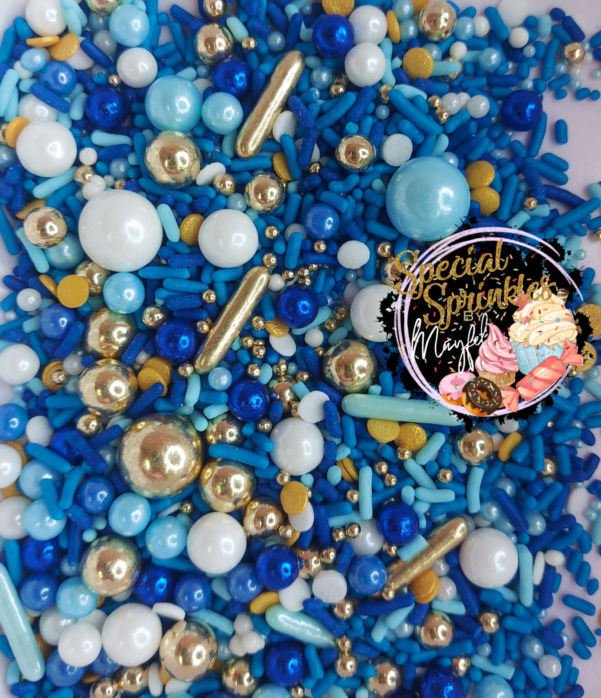 Mix de sprinkles con 3 tonalidades de azul, (azul, azul claro y azul royal) un toque brilloso metálico y blanco.